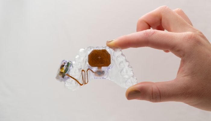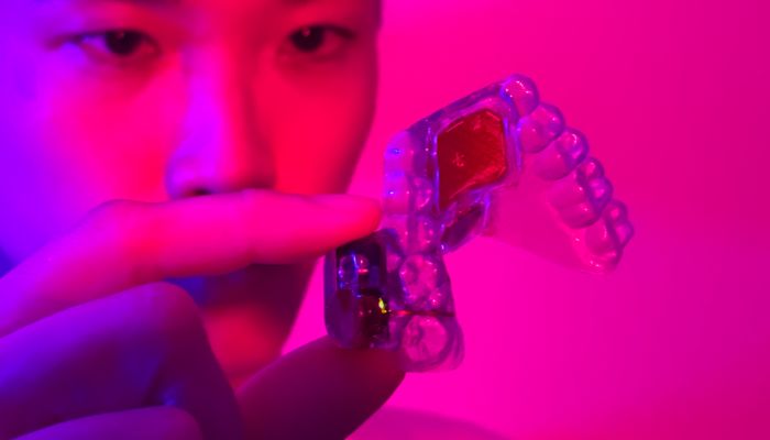 Pour la fabrication, nous utilisons la numérisation 3D intra-orale, la conception générative et paramétrique, et l’impression 3D SLA avec de la résine de qualité dentaire. Nous utilisons des composants électroniques flexibles et extensibles afin de nous adapter à différentes tailles de bouche.