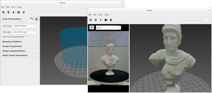 Le scanner sera équipé du logiciel Horus, permettant d’exporter les modèles numérisés aux formats PLY et STL. Horus sera compatible avec Windows (7, 8 et plus) et Linux (Ubuntu, Feroda).