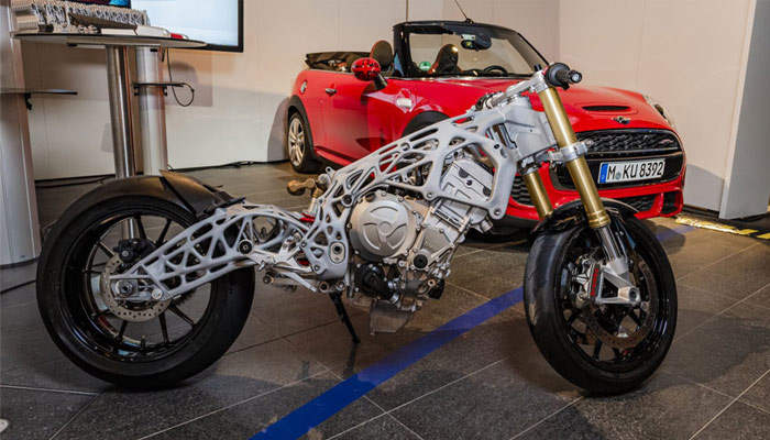 Unsere Experten von BMW Motorrad, aus dem Fachbereich der Additiven Fertigung sowie des Generative Designs haben an einer Konzeptstudie gearbeitet und gemeinsam Ideen entwickelt, wie Motorradrahmen künftig aussehen können. Basierend auf den Anforderungen hinsichtlich der Steifigkeit und des Gewichts des Bauteils haben sie mithilfe von Generative Design-Algorithmen eine komplexe Struktur entwickelt. Da die Geometrie dieses Bauteils sehr komplex ist, kam für uns nur die Herstellung im 3D-Druck-Verfahren in Frage. Die Konzeptstudie wurde einmalig durch selektives Laserstrahlschmelzen aus Aluminium hergestellt.