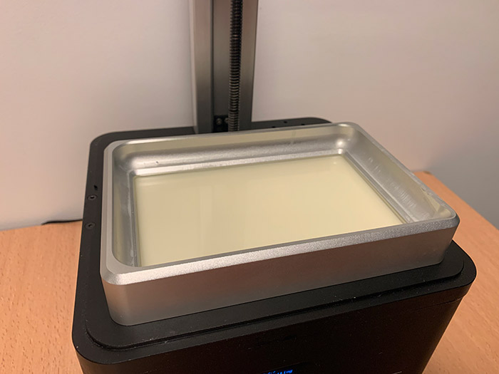 Sie können dann die Harzschale einsetzen, bevor Sie sie manuell mit dem gewünschten Material füllen (wie bei einem Slash+ 3D-Drucker). Es gibt keine automatische Befüllung des Tanks und keine Harzpatrone, die in die Maschine eingebaut werden muss. Dies ist etwas weniger „Plug & Play“ ist und mag manche Leute erschrecken, ist aber ohne echte Schwierigkeiten zu meistern.