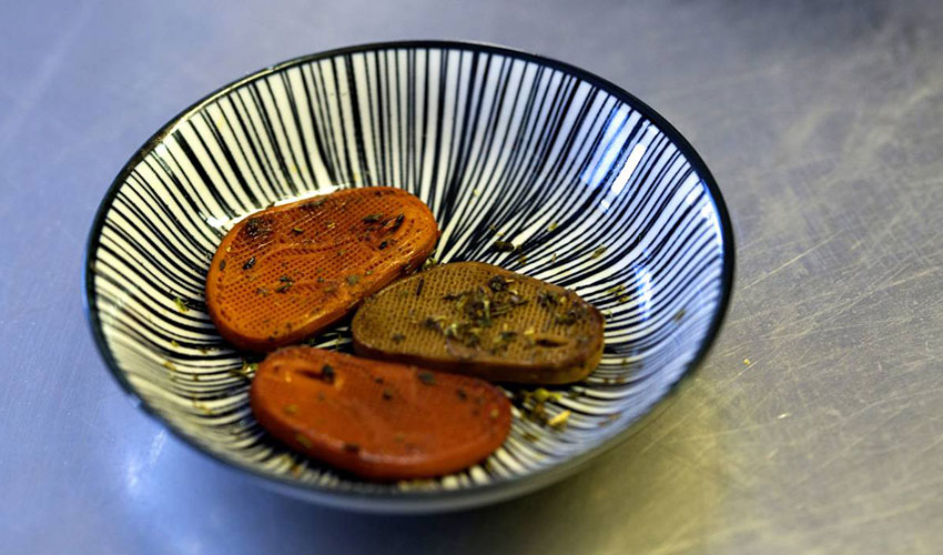 Das 3D gedruckte Steak von Giuseppe Scionti besteht aus Reis, Erbsen und Seetang. Aus diesen Zutaten gelang es dem Forscher, eine rötliche Paste herzustellen, deren Textur der von rotem Fleisch ähneln soll. Obwohl die Ästhetik des Endprodukts noch verbesserungswürdig ist, das Endziel ist klar: Der Ausbeutung von Tieren ein Ende zu setzen.