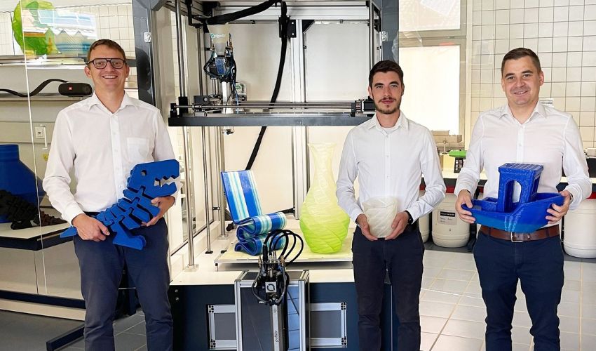 Mithilfe dieser Förderung konnte das Team den Drucker weiter überarbeiten und präsentiert nun – ein Jahr später – die Verbesserungen. Bauteile wurden so optimiert, dass die Effizienz gesteigert werden konnte. Außerdem ist der überarbeitete Drucker unempfindlicher gegenüber äußeren Temperatureinflüssen. Er kann mehr als 1 kg Kunststoff pro Stunde verarbeiten und Objekte mit einer Größe von 800 x 800 x 1000 mm herstellen. Durch den Direktextruder ist es möglich, Mischungen aus zerkleinerten Abfallresten aus Kunststoff und neues Granulat direkt für den Druck zu verwenden. Der optimierte Drucker kann auch höherwertige Industriekunststoffe recyceln, um deren Lebensdauer als Material voll auszuschöpfen. Der Schritt der Verarbeitung von Abfällen zu Filament entfällt bei diesem Recycling-Drucker. Somit soll der Aspekt der Kreislaufwirtschaft in der additiven Fertigung noch mehr gestärkt werden. Laut Prof. Wahl, Leiter der Arbeitsgruppe, wird „der 3D-Druck insbesondere durch den Entfall der Filamentherstellung ressourcenschonender“. Mehr dazu finden Sie HIER.