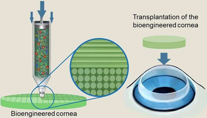 Die Forscher aus Südkorea versuchten dem entgegenzuwirken und verwendeten für ihre 3D-gedruckte künstliche Hornhaut, eine Bioink bestehend aus dezellularisiertem Hornhautstroma und Stammzellen. Dies macht die Hornhaut biokompatibel und weil die verwendete spezielle 3D-Drucktechnologie außerdem die Mikroumgebung der Hornhaut rekapituliert, ähnelt die Transparenz der künstlichen Hornhaut, der einer Menschlichen sehr stark. Die menschliche Hornhaut besteht aus einem Gitternetz aus Kollagenfasern, welche maßgeblich für die Transparenz der Hornhaut verantwortlich sind. Um dies auch in der 3D-gedruckten Hornhaut zu erreichen, verwendete das Forschungsteam die Scherung im 3D-Druck zur Herstellung des Gitternetzes der Hornhaut. Scherung entsteht aus der Reibungskraft beim 3D-Druck, welche auftritt, wenn die Tinte durch die Düse strömt und austritt. Die Forscher waren in der Lage dies zu kontrollieren und so das Gitttermuster aus Kollagenfasern zu erstellen.