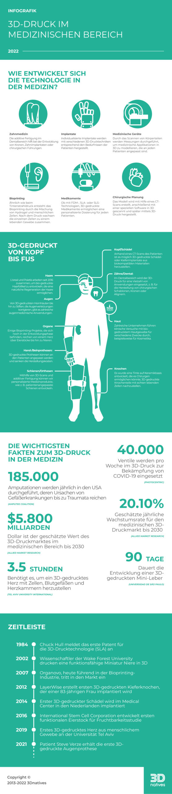 Um Ihnen einen Überblick über die bereits erzielten Erfolge zu verschaffen und einen Ausblick auf zukünftige Innovationen zu geben, hat 3Dnatives heute eine Infografik über die Möglichkeiten des 3D-Drucks im Medizinischen Bereich veröffentlicht (klicken Sie auf das Bild, um es zu vergrößern).