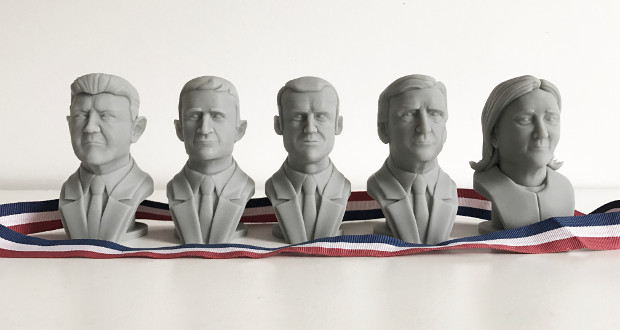 A quelques jours du premier tour des élections présidentielles 2017, la plate-forme française de fichiers 3D Cults a lancé une opération toute particulière : une série de bustes imprimables en 3D à l’effigie des cinq principaux candidats. De quoi afficher un soutien innovant pendant cette campagne !