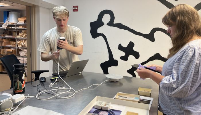 Andrew Francois, an intern working on the project, and Leah Stricker, a curator at Jamestown Rediscovery, work together to produce 3D scans and models. (Photo Credit: Ash Gonzales via William & Mary News)