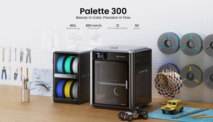 AtomForm announced the release of a 12-nozzle printer: the Palette 300. With a remarkable maximum print speed of 800 mm/s and promises of up to 90% filament saving, this printer is sure to catch attention if it can deliver. The machine has unique OmniElement automatic nozzle switching, which allows for up to 36 colors or 12 materials in one print. According to AtomForm, this leads to a 50% increase in material changing efficiency. The machine features a 350°C hotend, and when actively heated, the chamber reaches 65°C. These heating capabilities reduce warping and ensure strong adhesion. The Palette 300 will be available in early Q2 2026, with pre-orders starting in Q1.