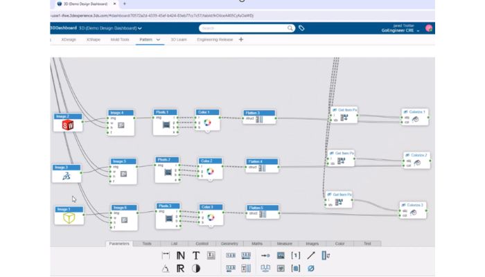 A snapshot of some of the nodes created using visual scripting in the 3DEXPERIENCE platform to interlace three different images.