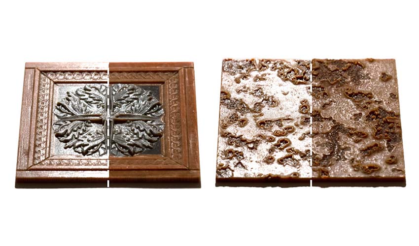As a matter of fact, glossiness is simply a measure of how much light is reflected from a surface. Varnishes that lend a glossy finish tend to be less viscous and to dry into a smooth surface. Varnishes that lend a matte finish are more viscous. Usual 3D printing hardware is not made to reproduce this varying reflectivity. The more viscous varnish (for the matte effect) contains large polymers that, when dried, protrude randomly from the surface and absorb light. Those polymers pose a dilemma for 3D printers, whose skinny fluid channels and nozzles aren’t built for this texture. “They’re very small, and they can get clogged easily,” explains Michael Foshey.