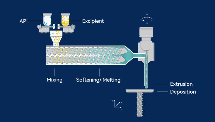Triastek’s Melt Extrusion Depostion (MED®) 3D printing process (Image Credit: Triastek)