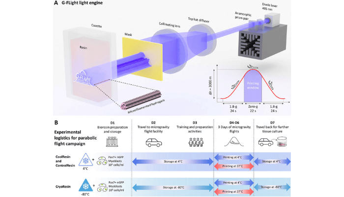 Diagram of the G-FLight bioprinting system and workflow, showing laser-based printing of bioresins and the experimental process used during parabolic flight. (Photo credit: ETH Zurich)