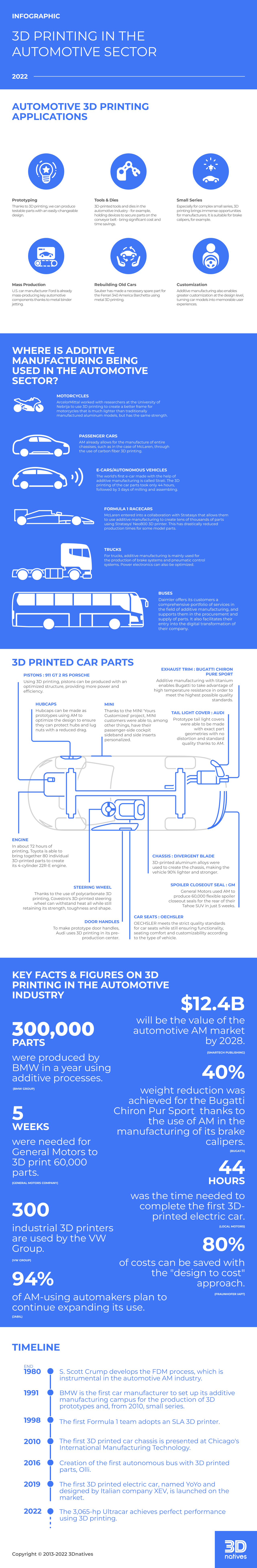 To better understand the evolution of 3D printing in the automotive sector including but not limited to current applications as well as some of the innovations that have been carried out, 3Dnatives is unveiling an infographic on the use of additive manufacturing in the automotive sector (click on the image to zoom in).