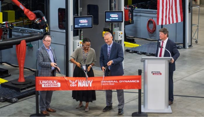 Mr. Mike Whitehead, Lincoln Electric’s President of Americas Welding, Ms. Larissa Smith, Director, Advanced Manufacturing, DRPM, Maritime Industrial Base Program, U.S. Navy, and Mr. Ken Jeanos, VP, Materials and Supply Chain, General Dynamics Electric Boat, lead the ribbon cutting to celebrate the investment of four SculptPrint™ 1500 additive manufacturing cells to support the production of critical submarine components.