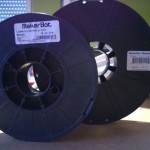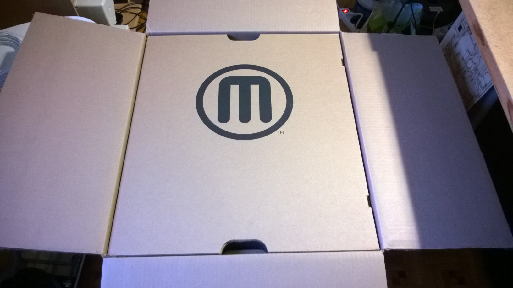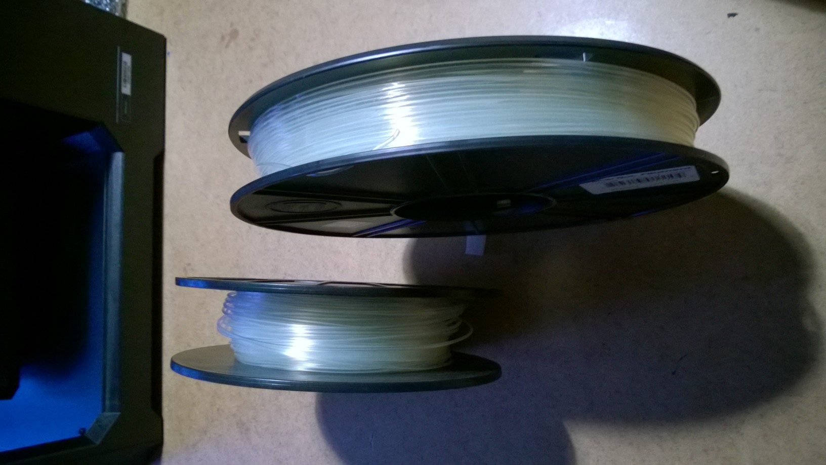 The printer isn’t even out of its box yet and we have discovered that they have delivered the machine with filament. It is the same type of filament that was supplied with our Replicator 2, transparent PLA 1.75 mm, but we did notice that the coil is much thinner than before; therefore it is also a lot larger.