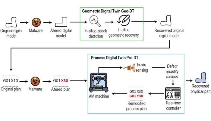 These digital twins “work in tandem to create resilience at key points of the manufacturing digital chain where cyberphysical attacks might occur – such as the part model, machine firmware and the process plan generation software,” Malhotra said.
