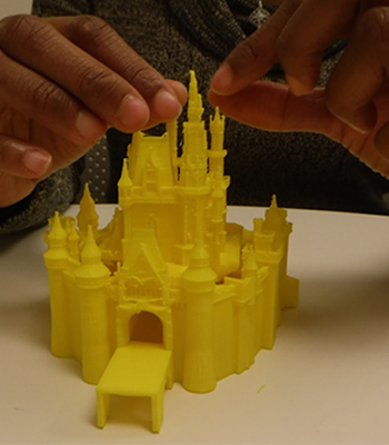- Cassandra examines a 3D print of a yellow Cinderella castle.