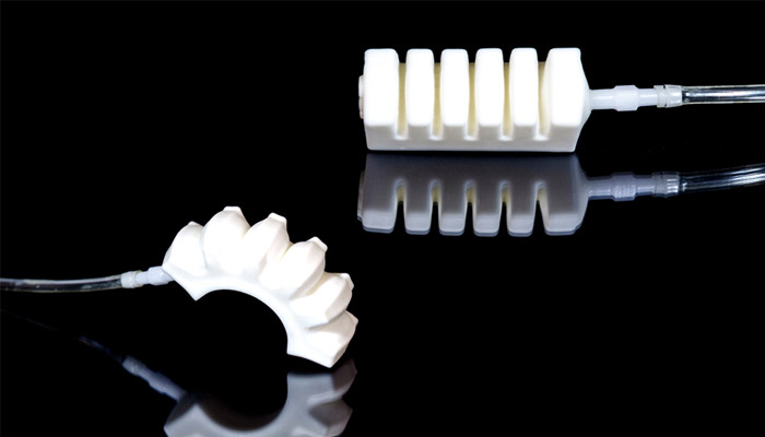 The materials used are compatible with SLA or DLP 3D Printing technologies, meaning that silicone parts can be directly fabricated straight out of a printer. Conventionally, silicone components are fabricated by injection moulding or casting that require moulds. This is both, lengthy and expensive. Direct fabrication allows circumventing the use of moulds completely.