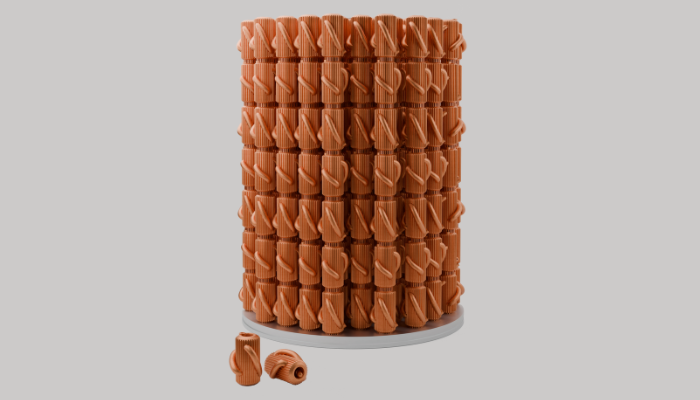 La validación funcional del proceso se llevó a cabo mediante la fabricación de una serie de demostradores industriales, entre los que destacan intercambiadores de calor, probetas y otras muestras, todo fabricado íntegramente en cobre. Uno de los logros más representativos del proyecto fue demostrar que esta tecnología permite apilar múltiples piezas y aprovechar todo el volumen disponible de la cámara de fabricación. Gracias a esta estrategia se puede apilar piezas de producción en serie, como las que se muestran en la imagen de abajo, en donde se pueden producir 368 intercambiadores dentro del volumen de 300 mm de diámetro y 400 mm de altura, confirmando así la capacidad del proceso para abordar lotes de fabricación a escala industrial.