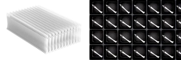 Nuestra solución utilizó la FA de cerámica para producir agujas cerámicas complejas hechas de alúmina (99.8% de pureza). Uno de los avances más significativos aquí es la capacidad de producir eficientemente estas piezas intrincadas en serie. Una sola plataforma de construcción permite la fabricación simultánea de 444 agujas idénticas y complejas. Cada aguja tiene aproximadamente 22,3 mm de largo, con un ojo preciso que se ensancha de 1 mm a 1,5 mm y requiere una tolerancia de ±0,025 mm.