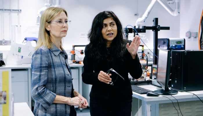 La profesora Veena Sahajwalla presenta la micro-fábrica a la Ministra de Medio Ambiente australiana Gabrielle Upton
