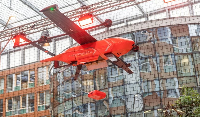 El dron es un dron eléctrico de ala fija, de despegue y aterrizaje verticales (eVTOL, por sus siglas en inglés). Para que estos movimientos verticales de despegue y aterrizaje sean posibles, el dron está equipado con un quadrotor. El dron se mueve de forma similar a un avión, se beneficia de una flotabilidad aerodinámica y está equipado con motores y hélices. «Nuestra aeronave no necesita una pista de despegue y aterrizaje», explica Park, responsable de CAD. “Tenemos ocho motores coaxiales que permiten que el dron despegue y aterrice verticalmente, así como dos hélices en las puntas de alas que permiten un vuelo horizontal. Esto significa que el espacio no es una limitación. La aeronave puede volar a cualquier lugar». El dron está hecho de fibra de carbono y, según Lukas Lindner, director general de HORYZN, puede transportar una carga útil de dos kilogramos a una velocidad de 120 km/h con solo 22 kilogramos de peso muerto.