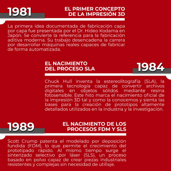 Hoy es una fecha especial, ya que es el día de la impresión 3D. El 3 de diciembre es, en efecto, una ocasión para celebrar las ventajas de la fabricación aditiva, sus avances y hacer un balance del mercado. Por ello, hemos querido destacar algunas fechas clave que han dado forma a las tecnologías 3D tal y como las conocemos hoy en día. ¡Y hay mucho que contar! Nos hemos centrado en 40 años de historia, desde los inicios de la impresión 3D hasta la fase actual de madurez e industrialización. Evidentemente, no podíamos repasar todos los acontecimientos del sector, por lo que hemos seleccionado tres momentos destacados por década. ¡No dudes en enviarnos tus comentarios y compartir los hechos que crees que han marcado a la industria!