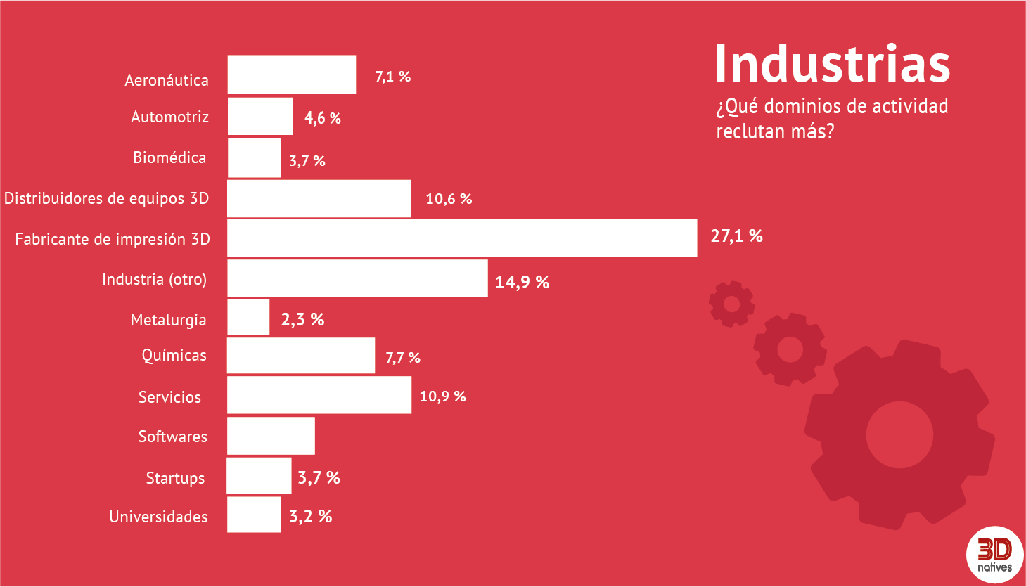 Sea cual sea el sector, la mayoría de empresas busca incorporar nuevos perfiles. Desde nuevas empresas hasta grandes grupos, incluidas las pymes, todo el campo de la fabricación aditiva está buscando nuevos talentos. Porque, si bien las grandes empresas ofrecen regularmente nuevos puestos de trabajo (36,3%), las pequeñas y medianas empresas abarcan el 30,7% de las ofertas publicadas. Estas cifras se pueden explicar por la gran cantidad de startups presentes en el mercado, pero también por el hecho de que grandes grupos se han convertido en usuarios de la tecnología 3D.