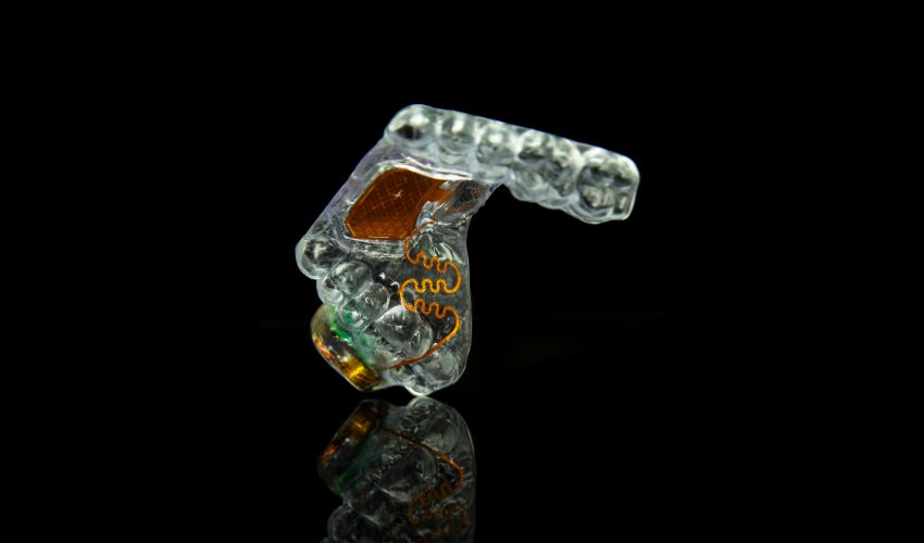 Para la fabricación, utilizamos escaneo 3D intraoral, diseño generativo y paramétrico e impresión 3D SLA con resina de grado dental. Utilizamos electrónica flexible y elástica para adaptarnos a varios tamaños de boca.