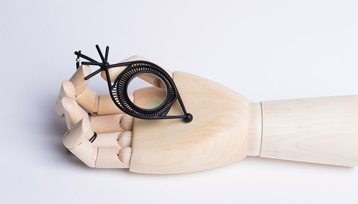 La presbytie est un trouble de la vue qui apparait vers 45 ans et qui affecte la vision de près. Tendre le bras pour lire correctement un document en est le premier signe ! Progressivement, porter des lunettes devient indispensable… mais pas tout le temps. Ces dernières sont donc laissées sur son lieu de travail ou chez soi. Ce sont sur ces éléments que s’est construite la première collection de bijoux optiques f-elia. Le concept de la marque s’articule autour d’un surprenant bijou imprimé en 3D, mêlant passé et futur de la lunette d’appoint. Le bijou se métamorphose en face-à-main ou en loupe pour lire le plan du métro, un menu, ses sms, et plus encore!