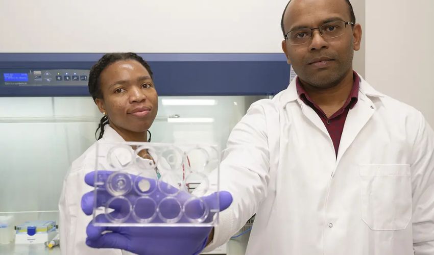 Elom Doe (a sinistra), dottoranda in Scienze Farmaceutiche, e Jaidev Chakka (a destra), ricercatore principale della Facoltà di Farmacia. (Crediti foto: Hunt Mercier/Ole Miss Digital Imaging Services).