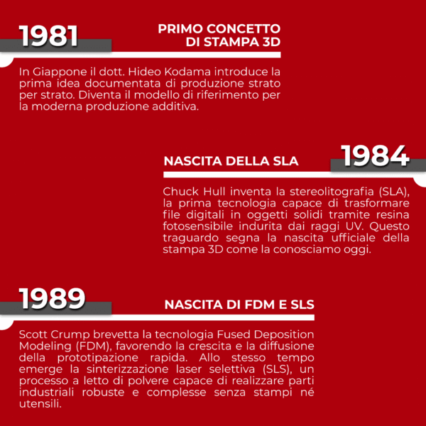 Oggi è una data particolare perché è il giorno della stampa 3D. Il 3 dicembre è infatti l’occasione per celebrare i vantaggi della produzione additiva, i suoi progressi e per fare il punto sul mercato. Abbiamo quindi voluto evidenziare alcune date chiave che hanno plasmato le tecnologie 3D come le conosciamo oggi. E c’è molto da dire! Ci siamo concentrati su 40 anni di storia, dagli inizi della stampa 3D a questa attuale fase di maturità e industrializzazione. Ovviamente non potevamo tracciare tutti gli eventi del settore, quindi abbiamo scelto tre momenti salienti per decennio. Non esitate a commentare con le vostre impressioni e a condividere con noi i fatti che vi hanno segnato!