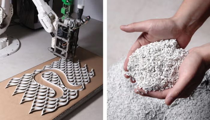 Un point central de ce projet réside dans le choix des matériaux. L’ensemble des éléments est imprimé en 3D à partir d’un mélange de déchets de consommation recyclés par Aectual. Cette approche s’inscrit pleinement dans l’ADN du studio, qui a fait de l’économie circulaire un pilier de son modèle. Aectual propose en effet de récupérer des pièces et composants en fin de vie afin de les réimprimer sous forme de nouveaux produits architecturaux, créant ainsi une boucle de fabrication vertueuse.
