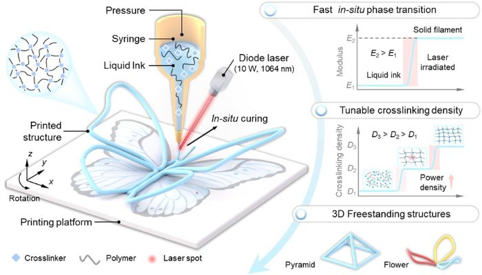 Dezhi Wu est co-auteur principal de l’article derrière cette recherche. Elle explique : “Les matériaux thermodurcissables (tels que les silicones) sont largement utilisés dans les applications d’ingénierie et d’infrastructure. Cependant, leurs processus d’impression 3D souffrent d’un temps de durcissement prolongé et compliquent les structures de soutien nécessaires à la fabrication de structures autonomes, car celles-ci s’affaissent et s’effondrent avant la solidification. Les outils de fabrication laser de notre laboratoire sont utilisés pour imprimer directement des matériaux d’encre thermodurcissables afin de durcir l’encre instantanément.”
