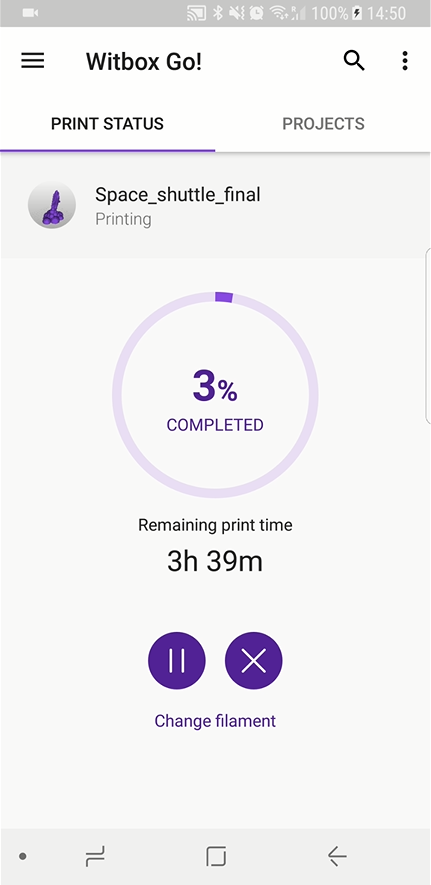 Avec un système d’exploitation signé Android, vous aurez bien entendu accès à une application mobile disponible sur le store de Google afin de garder un oeil sur votre imprimante depuis votre smartphone. Là encore, l’interface est plutôt sympathique et elle vous permettra de surveiller certains paramètres comme le temps restant d’impression. Mais ne vous emballez pas, il n’y a pas de slicer intégré à l’application, cela reste principalement du monitoring bien que vous puissiez néanmoins lancer une impression. Celle-ci devra être préalablement slicée depuis votre ordinateur et sauvegardée dans la mémoire interne de l’imprimante.