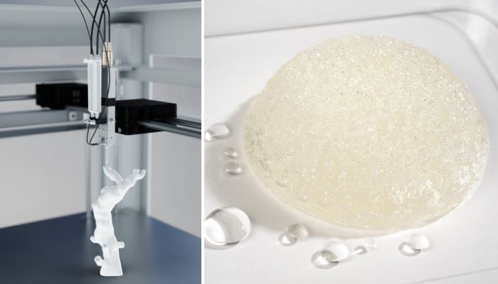 À gauche, représentation visuelle du produit médical vipro-HEAD pendant l’impression 3D d’une aorte en silicone (crédits photo : ViscoTec) ; à droite, implants mammaires résorbables à base d’hydrogel fabriqués à l’aide de têtes d’impression 3D ViscoTec. (crédits photo : Healshape)